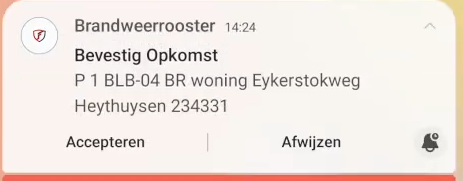 The notification arrives as a push message on your smartphone. The app is designed so that the alarm sound can break through your phone's silent mode, ensuring that you don't miss any notifications. You can confirm your attendance directly via the push message. Please note! This screenshot is from the Brandweerrooster app and is therefore in Dutch. The notification will look exactly the same in the FireServiceRota app, but in a different language.