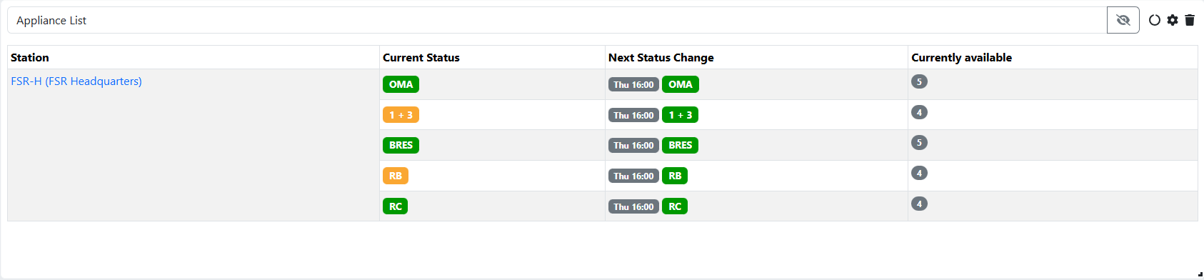 The Appliance List widget provides a clear overview of crewing at station, cluster, and regional level. At a glance, you can see the current status and the next change for all appliances to which you have access.