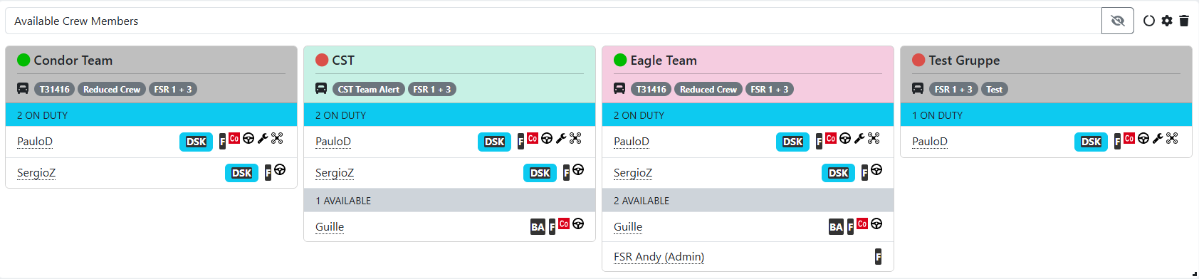 The Available Crew Members widget displays a station's current crew availability. The widget shows which crew members are on standby, who is on standby in specific teams, and any on-call personnel. A person on-call is displayed in a blue frame. The teams automatically scale with the widget; if you make the widget wider, more teams can fit.