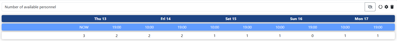The number of available personnel widget shows the total number of available personnel in the stations you have access to. This is measured at two specific times of the day: the standard 10:00 AM (daytime) and 7:00 PM (evening). At these checkpoints, the number of on-call staff with a specific role is displayed. The widget can be customized with filters in a similar way to the contact list widget.