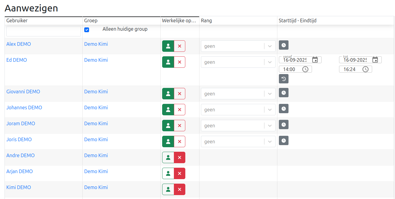 Stap 8.) Kies per persoon of de persoon aanwezig (groen) of afwezig (rood) was. Vul eventueel een afwijkende start- en eindtijd in door op de rij van de gebruiker op het klokje te klikken en vervolgens de start- en eindtijd in te vullen.