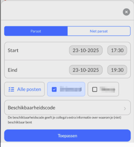 Navigeer in de persoonlijke kalender naar de dag waarop je beschikbaarheid wilt aanpassen. Druk vervolgens op het tijdstip waar je de beschikbaarheid voor wilt aanpassen. Vul vervolgens een start- en eindtijd in, kies een post en druk vervolgens op de knop 'Toepassen'.