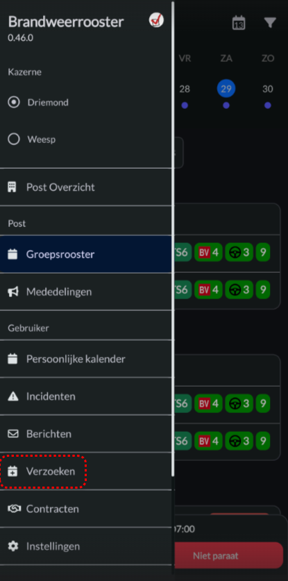 Het is mogelijk om via de Brandweerrooster app verlof aan te vragen. Dit doe je door onderstaande stappen ter volgen:
