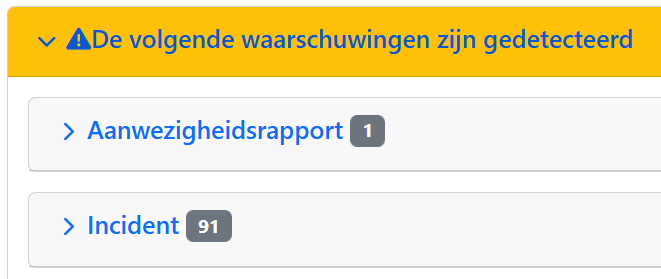 Door op de waarschuwingsknop te klikken, kan je een lijst zien van activiteiten/overuren/incidenten die niet in het rapport worden weergegeven en de reden waarom.