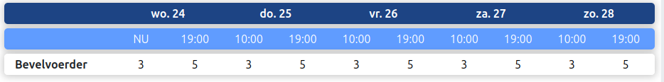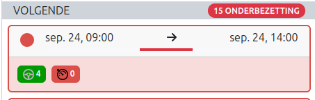 De widget voor onderbezettingswaarschuwingen geeft je in één oogopslag een voorspelling van de bezetting voor de komende dagen. De widget toont de paraatheidseisen en de bezetting voor alle voertuigen op de post. Als een voertuig onderbezet is, wordt het tijdsvak rood gearceerd. Deze widget geeft een overzicht tot maximaal vijf dagen vooruit. Als je post meerdere voertuigen of controles heeft, kun je de widget verbreden voor een beter overzicht.