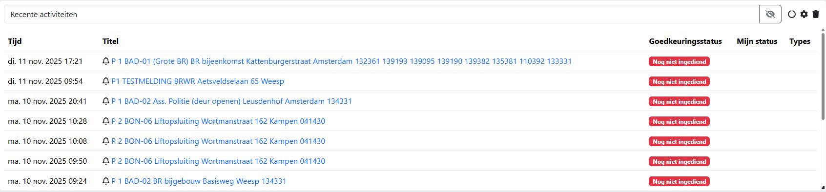 De widget 'Recente activiteiten' toont recente incidenten, incidentrapporten en aanwezigheidsrapporten met zelf-configureerbare kolommen.